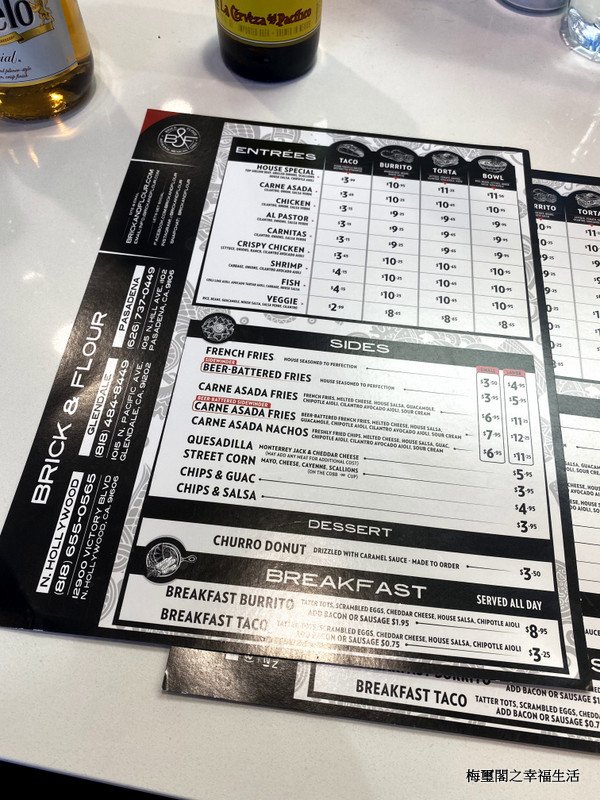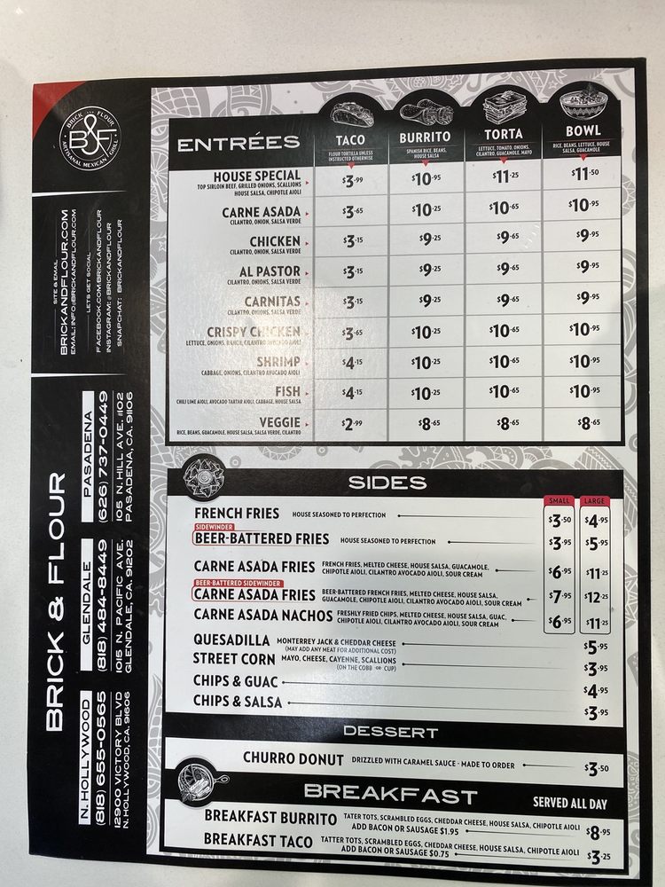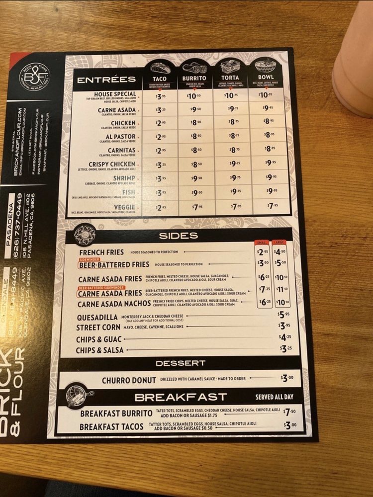 Brick and Flour is a Mexican restaurant located in Pasadena, CA, offering a variety of delicious options for all meals of the day. They provide delivery, takeout, and even catering services, making it convenient for customers on-the-go. The menu features mouthwatering burritos like the Al Pastor Burrito and Carne Asada Burrito, flavorful tacos such as the Al Pastor Taco and Crispy Chicken Taco, and satisfying tortas like the Carne Asada Torta and Chicken Torta. With vegan and limited vegetarian options available, there is something for everyone to enjoy. The trendy and hipster ambiance, along with happy hour specials and outdoor seating, creates a welcoming atmosphere for guests. Overall, Brick and Flour offers a unique and tasty Mexican dining experience that is sure to impress.